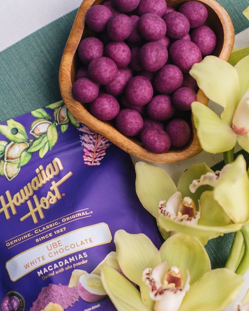 Earthy-sweet ube meets creamy white chocolate, coating rich, dry-roasted macadamias layer by layer and finished with a delicate dusting of ube powder. A vibrant delight awaits!